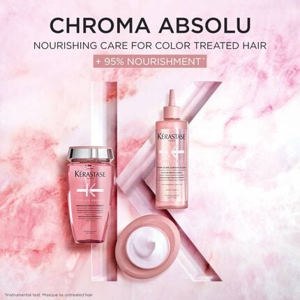 The Kérastase Chroma Absolu range of colored hair products is designed to protect and enhance color-treated hair. They help to strengthen hair fibres, reduce damage, and maintain vibrant color while providing deep nourishment. The range targets porosity, prevents fading, and boosts shine, making it ideal for preserving the health and radiance of dyed or highlighted hair. Regular use of the Chroma Absolu colored hair products provides 95% nourishment* to color-treated hair.